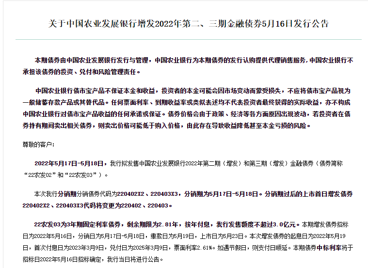 公告称:我行将于5月17日-5月18日发售中国农业发展银行2022年第二期(增发)和第三期(增发)金融债券(债券简称“22农发02”和“22农发03”)。