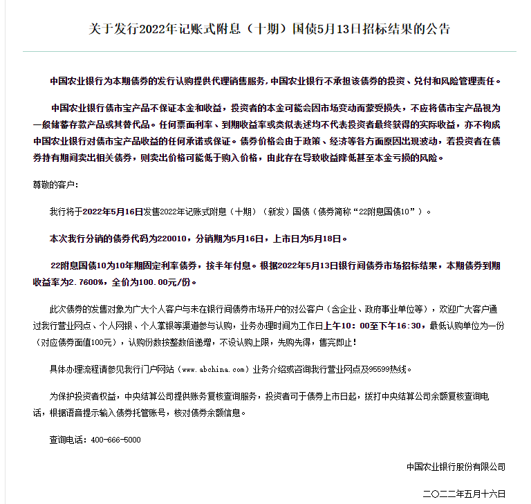 5月16日,农行在官网发布《关于发行2022年记账式附息(十期)国债5月13日招标结果的公告》。