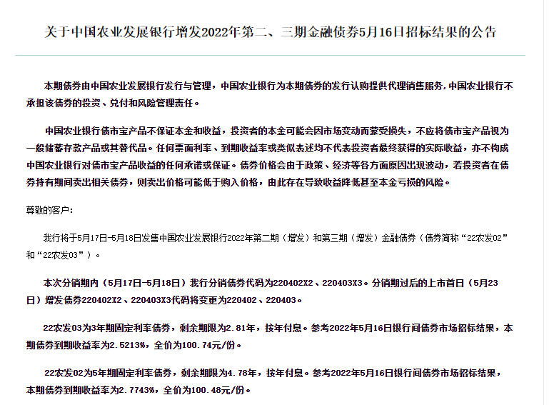 3、关于中国农业发展银行增发2022年第二、三期金融债券5月16日发行公告。