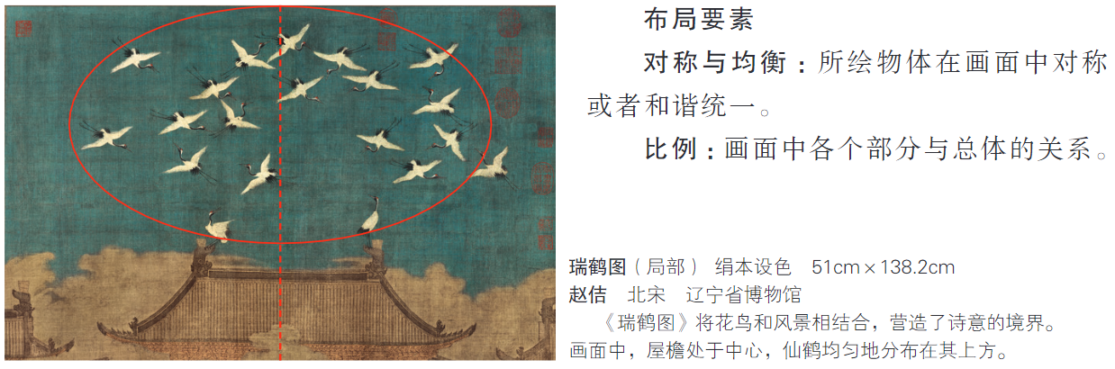 △高中美术课本《中国书画》分册中对瑞鹤图的介绍,该图出现在“画中有诗”一课(人民美术出版社)