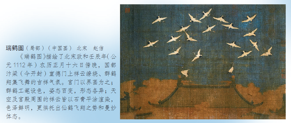 △七年级美术课本中“绘画风格与流派”一课,介绍《瑞鹤图》(广西美术出版社)